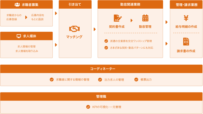 MatchinGood(マッチングッド)は求職者の募集・引き当てから契約・勤怠管理・請求業務までを一元管理できる、中小企業向けクラウド型業務基幹システムです。人材紹介業にも対応しており、小規模な人材紹介会社様や、人材派遣・紹介業を兼業されている企業様にもご活用頂いています。